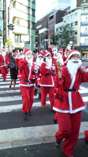 表参道をブラブラしてたらはとバスからサンタクロースの集団が降りてビックリ(@_@)